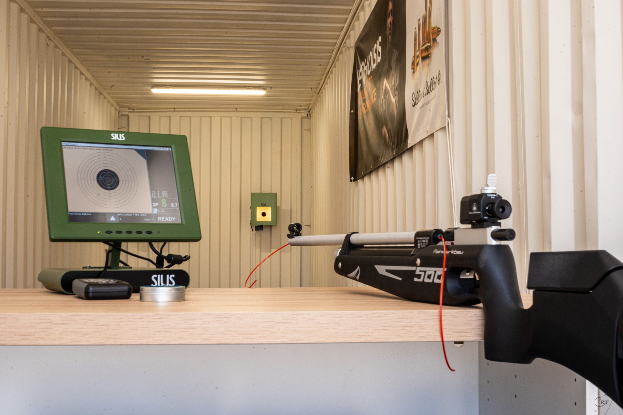 Salle dédiée aux armes de poings tous calibres, mais aussi AR15 ou AR9. Équipée de rameneurs électriques, vous avez la possibilité de sélectionner votre distance : 10 ou 25m.